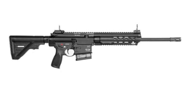 Das Heckler & Koch MR308A3 ist eine halbautomatische Selbstladebüchse im Kaliber 7,62 × 51 mm NATO (.308 Win) mit einem 16,5-Zoll-Lauf aus hartverchromtem Stahl, der hohe Präzision und lange Lebensdauer bietet. Das Gaskolbensystem mit kurzem Hub, abgeleitet vom G36, sorgt für zuverlässiges Funktionieren und reduziert Verschmutzungen. Der freitragende Slim-Line-Handschutz aus Aluminium verfügt über HKey- und M-LOK-Schnittstellen zur Befestigung von Zubehör, ohne die Laufschwingung zu beeinträchtigen. Ober- und Unter-Receiver bestehen aus robustem 7075-T6-Aluminium; der obere Receiver besitzt Mil-Spec-Indexierungsmarkierungen und M4-Feedramps für reibungsloses Zuführen der Munition. Die Bolt Carrier Group ist hartverchromt und militärspezifikationstauglich geprüft, um maximale Zuverlässigkeit zu gewährleisten. Ergonomische Merkmale umfassen beidseitig bedienbaren Ladehebel, beidseitigen Magazinauswurf, abgewinkelten Pistolengriff, verstellbare G28-DBM-Schulterstütze mit Wangenauflage und feststehenden Kimmen- und Kornvisierungen. Die Magazinkapazität beträgt 10 Schuss. Mit einem Gewicht von etwa 4,3 kg (ohne Magazin) und einer Gesamtlänge von 90,5 bis 98,5 cm bietet das MR308A3 eine ausgewogene Balance aus Stabilität und Wendigkeit. Die Oberfläche in mattem Schwarz ist harteloxiert und korrosionsresistent.