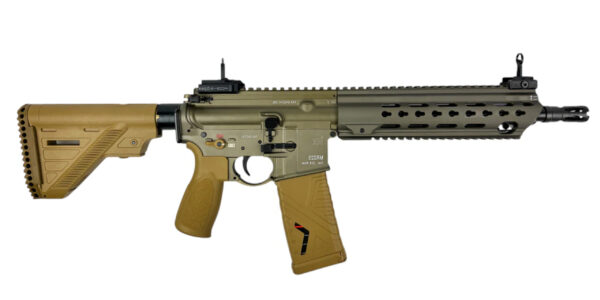Das Heckler & Koch MR223 A3 ist ein halbautomatisches Gewehr im Kaliber 5,56 × 45 mm NATO mit einem 14,5-Zoll (ca. 36,8 cm) Cold-Hammer-Forged-Lauf aus Chromstahl, der eine hohe Präzision und lange Lebensdauer gewährleistet. Das Gewehr nutzt das bewährte Piston-Gassystem aus dem G36, was zuverlässiges Funktionieren selbst unter widrigen Bedingungen sicherstellt und den Rückstoß reduziert. Der freitragende Slim-Line-Handschutz besteht aus leichtem Aluminium mit M-LOK-Schnittstellen, um Zubehör wie Optiken, Griffe oder Lampen ohne Beeinträchtigung der Laufschwingung schnell anzubringen. Ober- und Unterreceiver sind aus 7075-T6-Aluminium CNC-gefertigt; der obere Receiver verfügt über Mil-Spec-Indexierungsmarkierungen und integrierte M-4-Feedramps für reibungsloses Einführen der Munition. Die Bolt Carrier Group ist hartverchromt und MIL-Spec-MP-getestet, um maximale Zuverlässigkeit zu garantieren. Ergonomische Merkmale umfassen einen beidseitig bedienbaren Ladehebel, einen rutschfesten Pistolengriff, einen sechsfach verstellbaren Schaft mit Soft-Touch-Überzug sowie einen erweiterten Magazintrichter für zügiges Nachladen von STANAG-Magazinen. Die charakteristische Grün-Braun-Beschichtung (RAL 8000) ist eine haltbare Cerakote-Oberfläche, die Korrosionsbeständigkeit und Vernarbungsschutz bietet. Mit einem Gesamtgewicht von etwa 3,5 kg (ohne Magazin) und einer Gesamtlänge von rund 84 cm ist das MR223 A3 kompakt, wendig und vielseitig einsetzbar bei taktischen oder sportlichen Anwendungen.